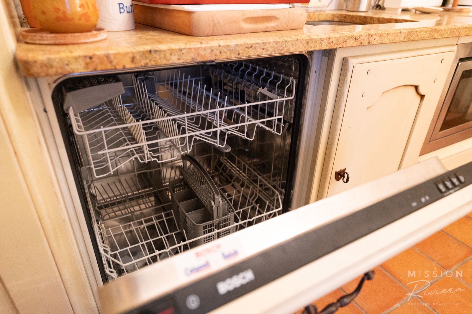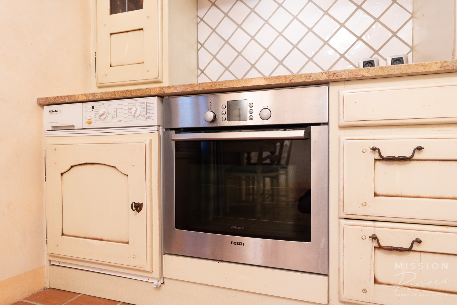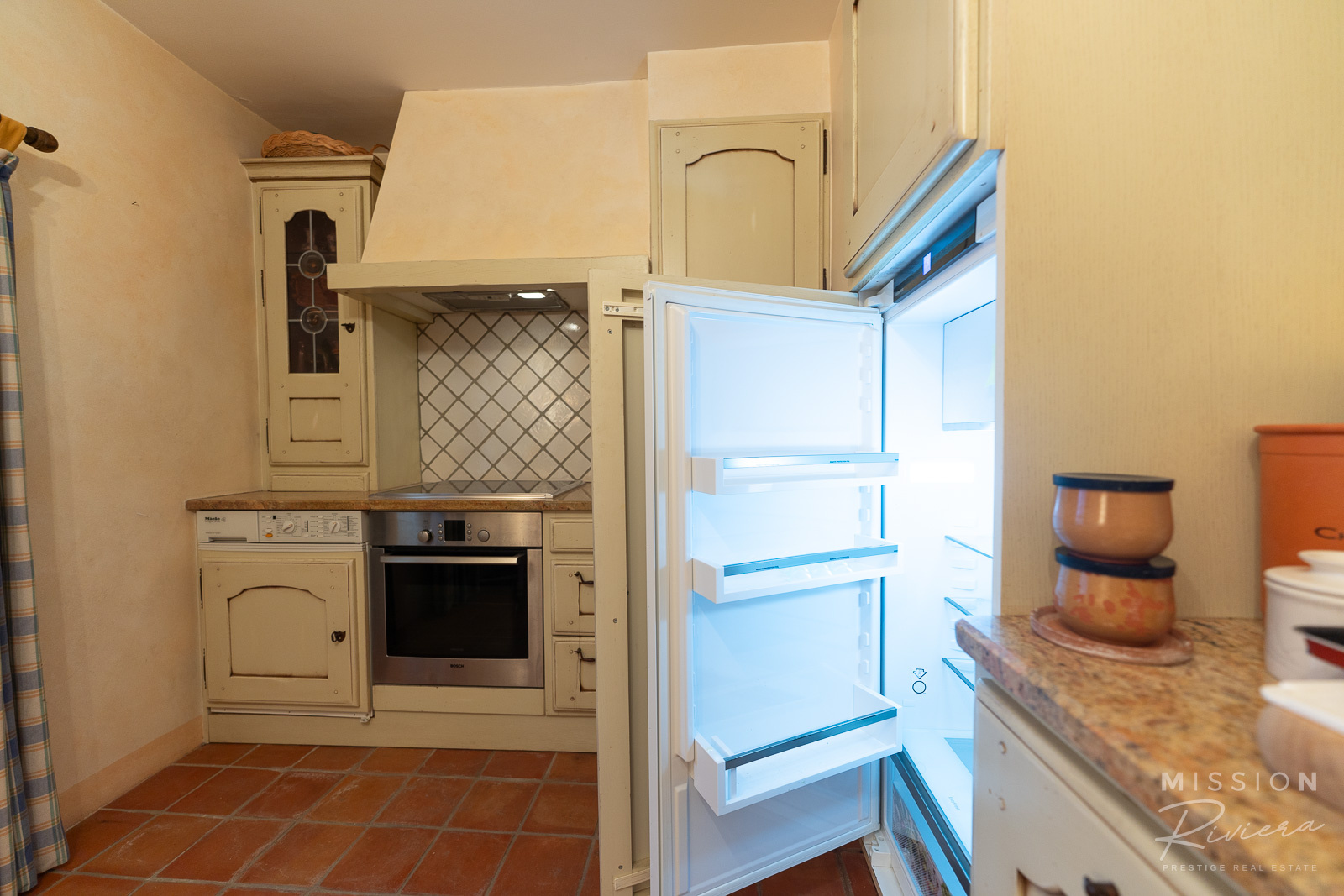En entrant dans l’appartement, la première pièce est la cuisine, qui est semi-séparée du reste de l’appartement et qui est étonnamment spacieuse. La cuisine est « pleine grandeur » et offre beaucoup d’espace pour préparer, cuisiner et servir, avec une table de cuisine pour les repas occasionnels, etc. La cuisine est bien équipée ; les placards et les meubles reflètent le style rustique de l’appartement, en harmonie avec le caractère du village lui-même. Une petite fenêtre apporte de la lumière à la cuisine et donne sur la rue en contrebas.