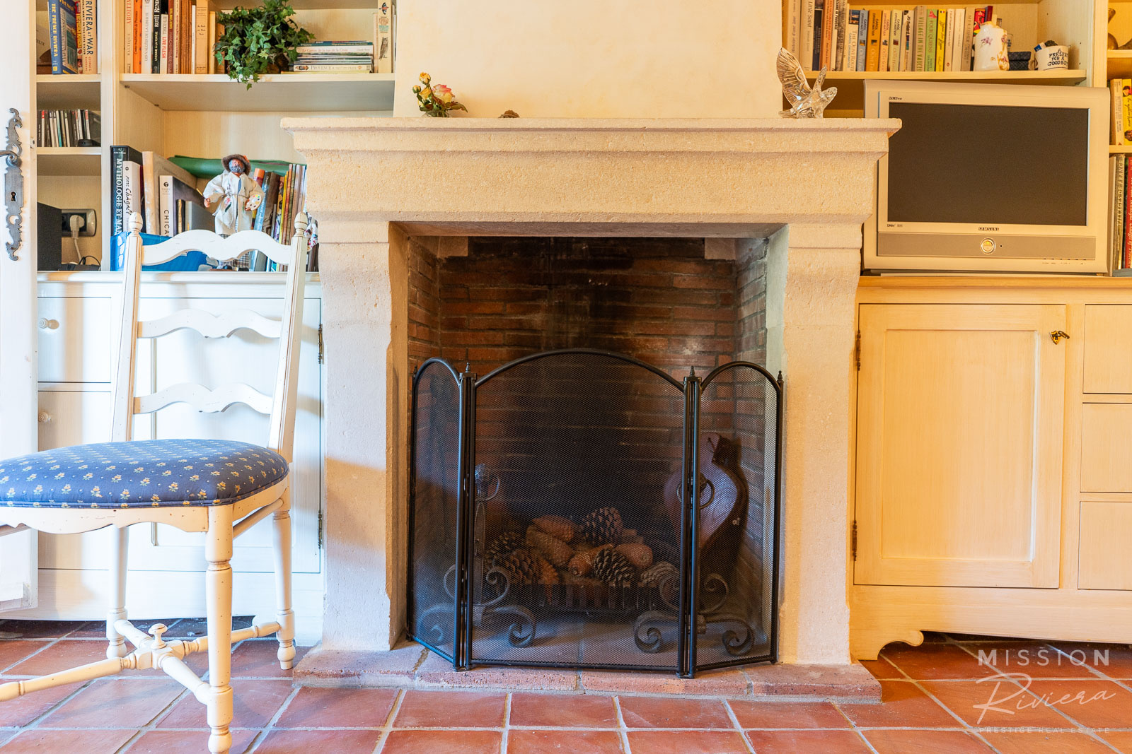 Un petit escalier mène de la cuisine au salon principal, créant une impression de séparation sans pour autant isoler la cuisine. Le salon/chambre principale mesure un peu moins de 20 m² et, avec son haut plafond avec poutres apparentes et sa cheminée traditionnelle, il est vraiment très confortable. Des étagères traditionnelles en bois sont installées de chaque côté de la cheminée et de nombreux placards sont également disponibles. De l’autre côté de la pièce, des placards allant du sol au plafond permettent de ranger discrètement le linge de lit et les vêtements.