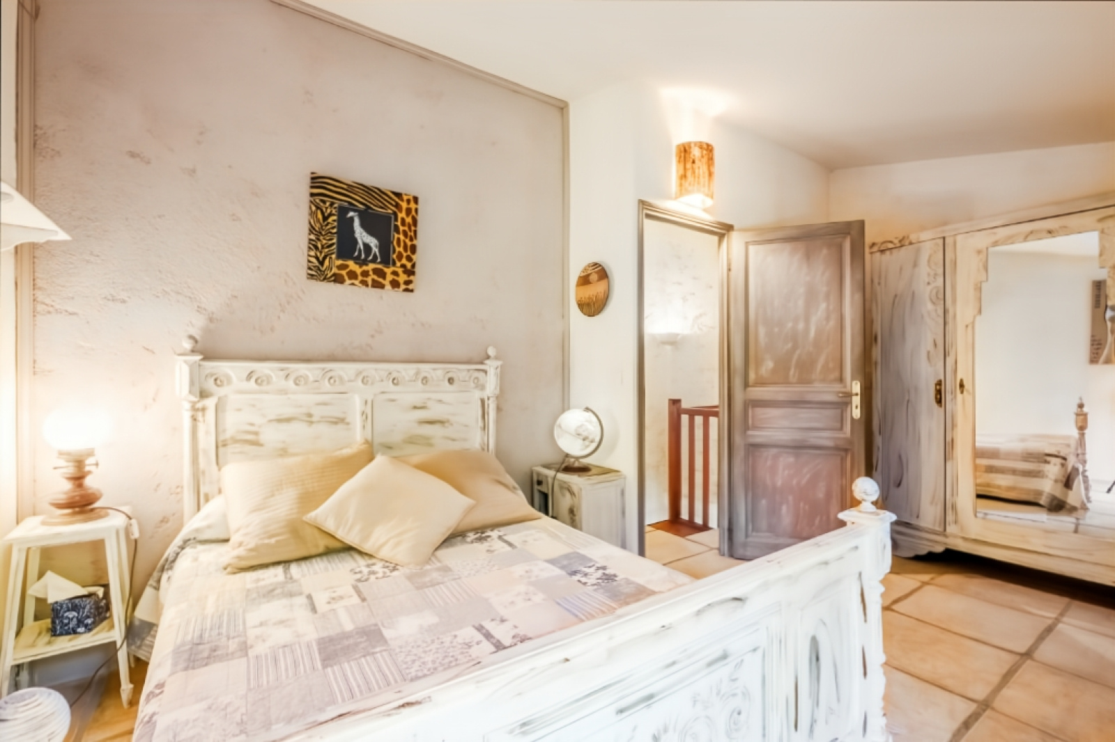 L’espace nuit comprend 8 chambres, dont 3 avec leur salle d’eau privative. Chacune profite d’une vue remarquable sur les collines environnantes. Une petite chapelle s’ouvre sur une cour intérieure intime, apportant un supplément d’âme rare à l’ensemble.