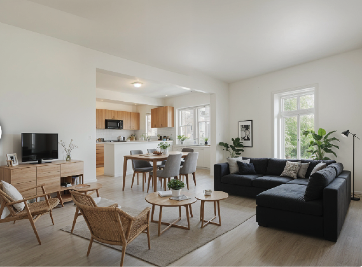 Son séjour lumineux de presque 34m2 avec la possibilité d’ouvrir la cuisine et le hall pour créer une pièce de 47m2