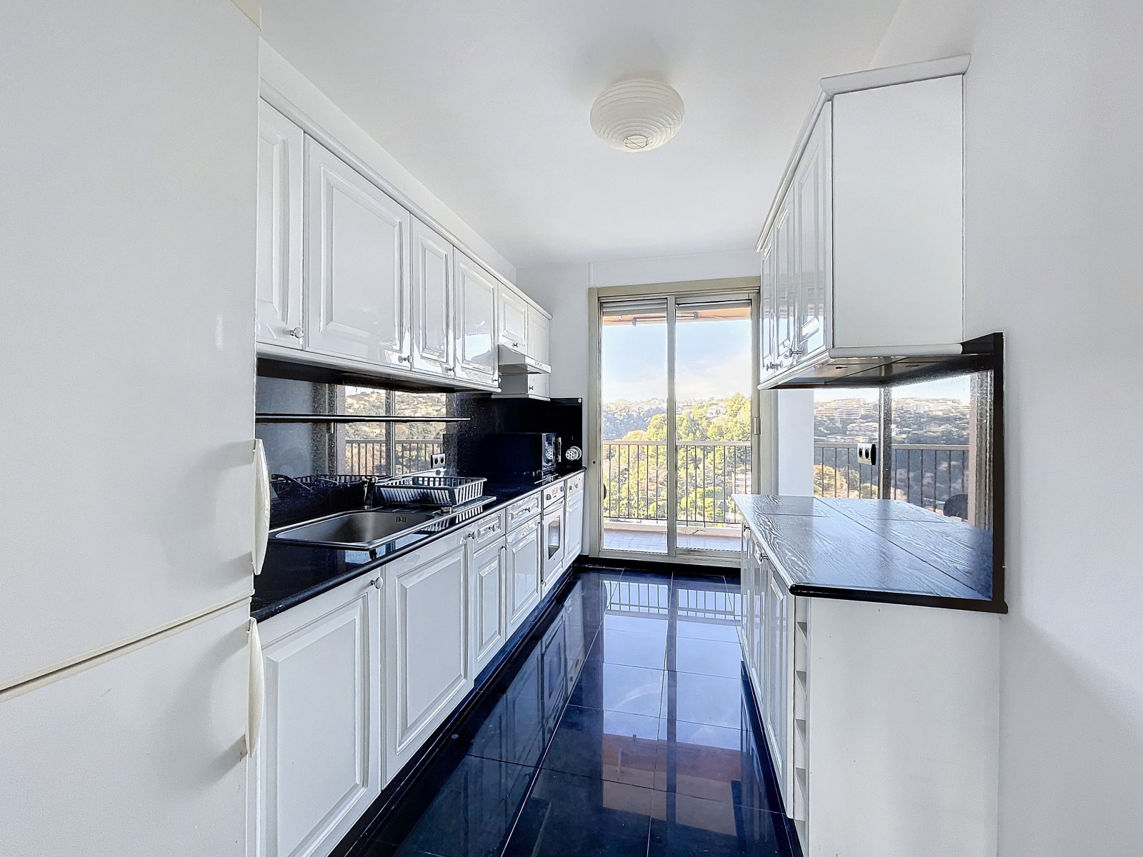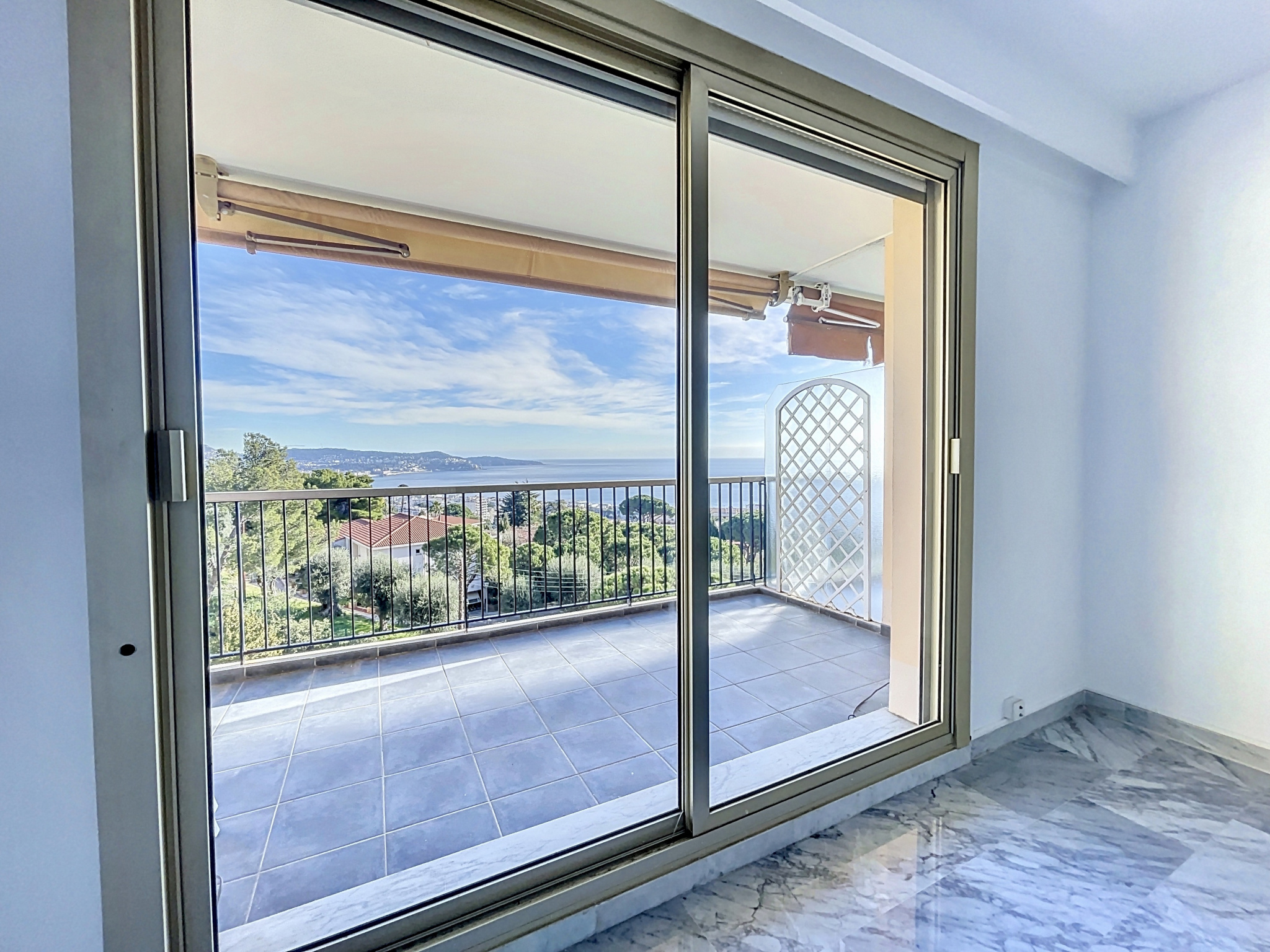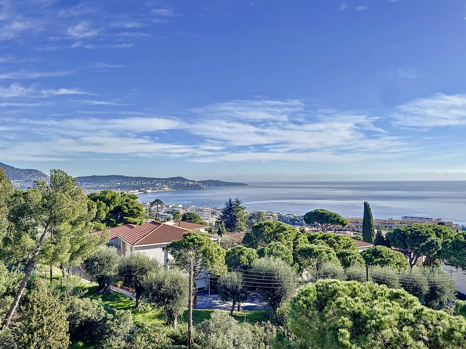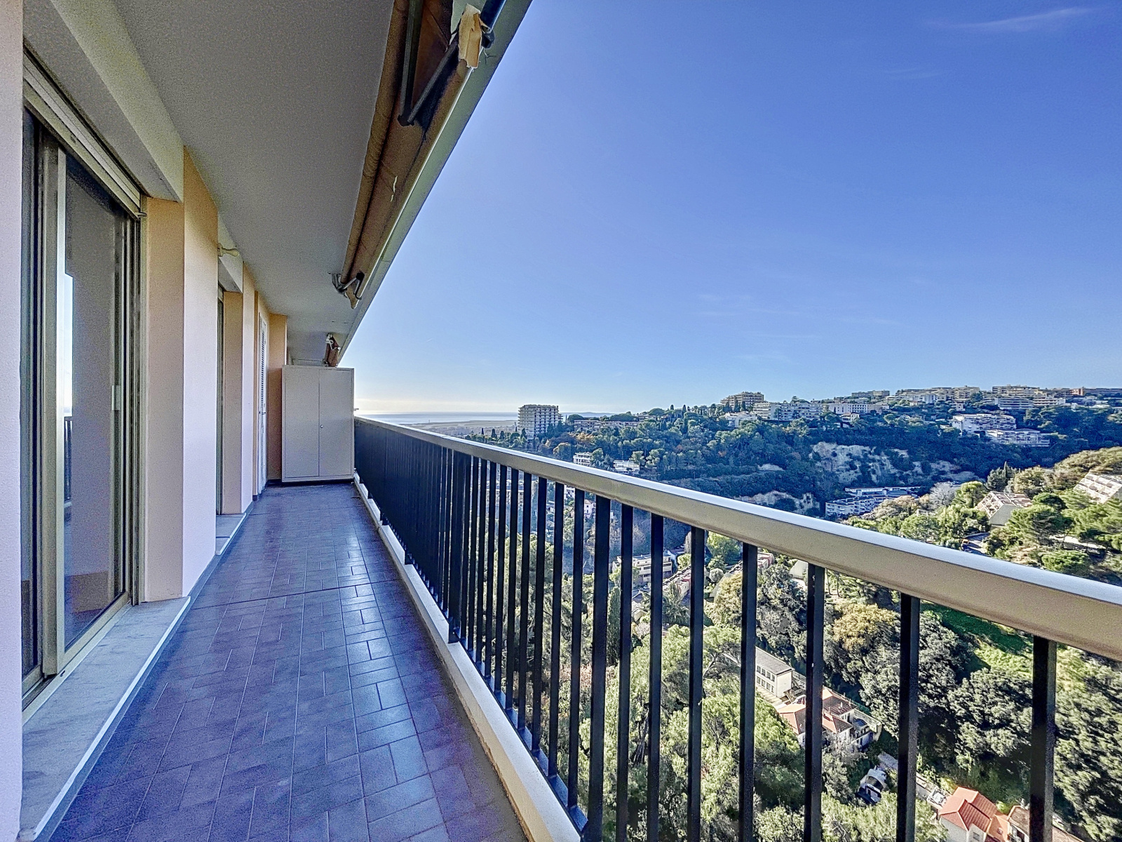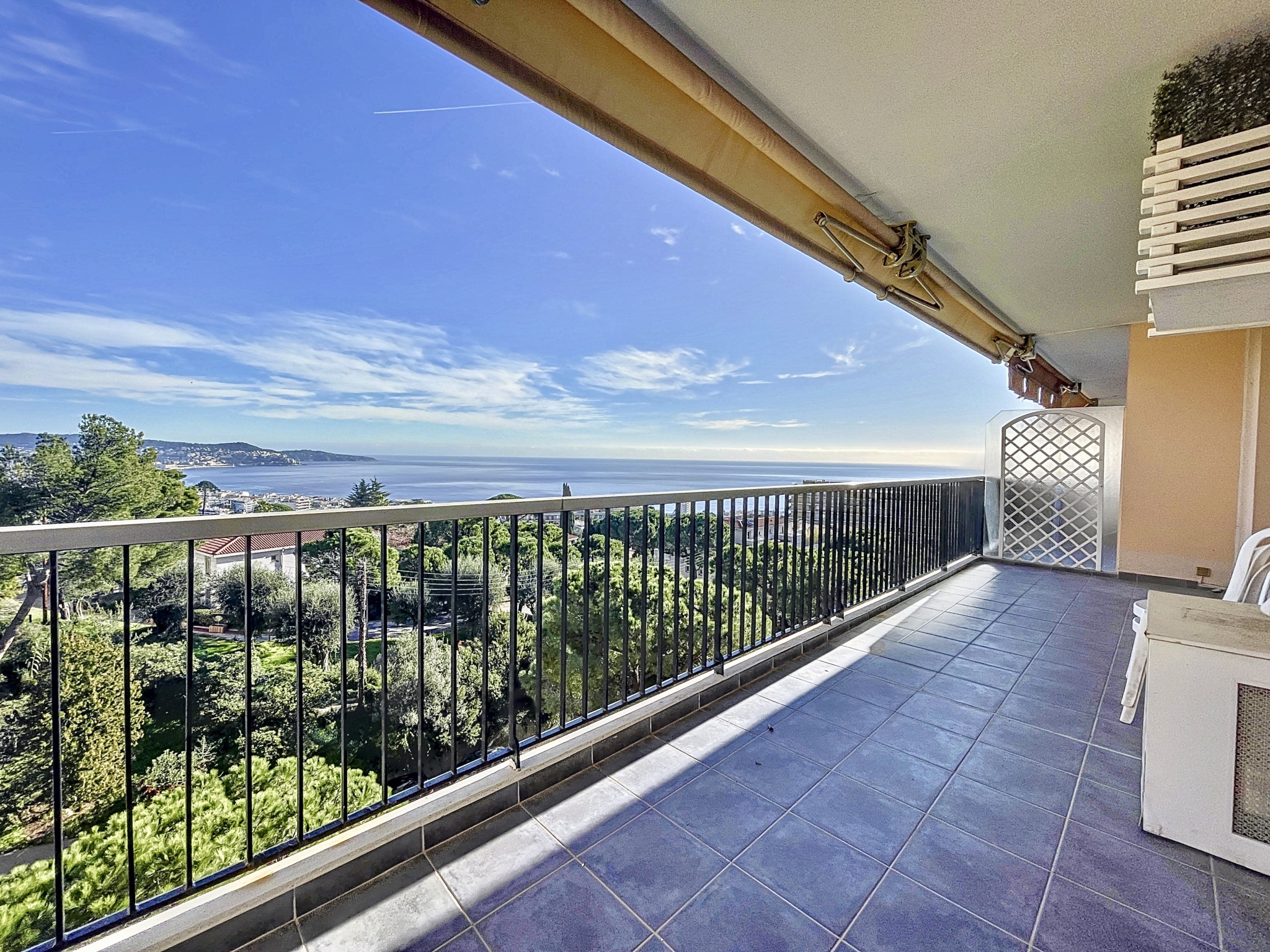 Toutes les pièces donnent sur une large terrasse agrémenté d'une superbe vue sur la mer, Nice et son port, le Cap Ferrat.