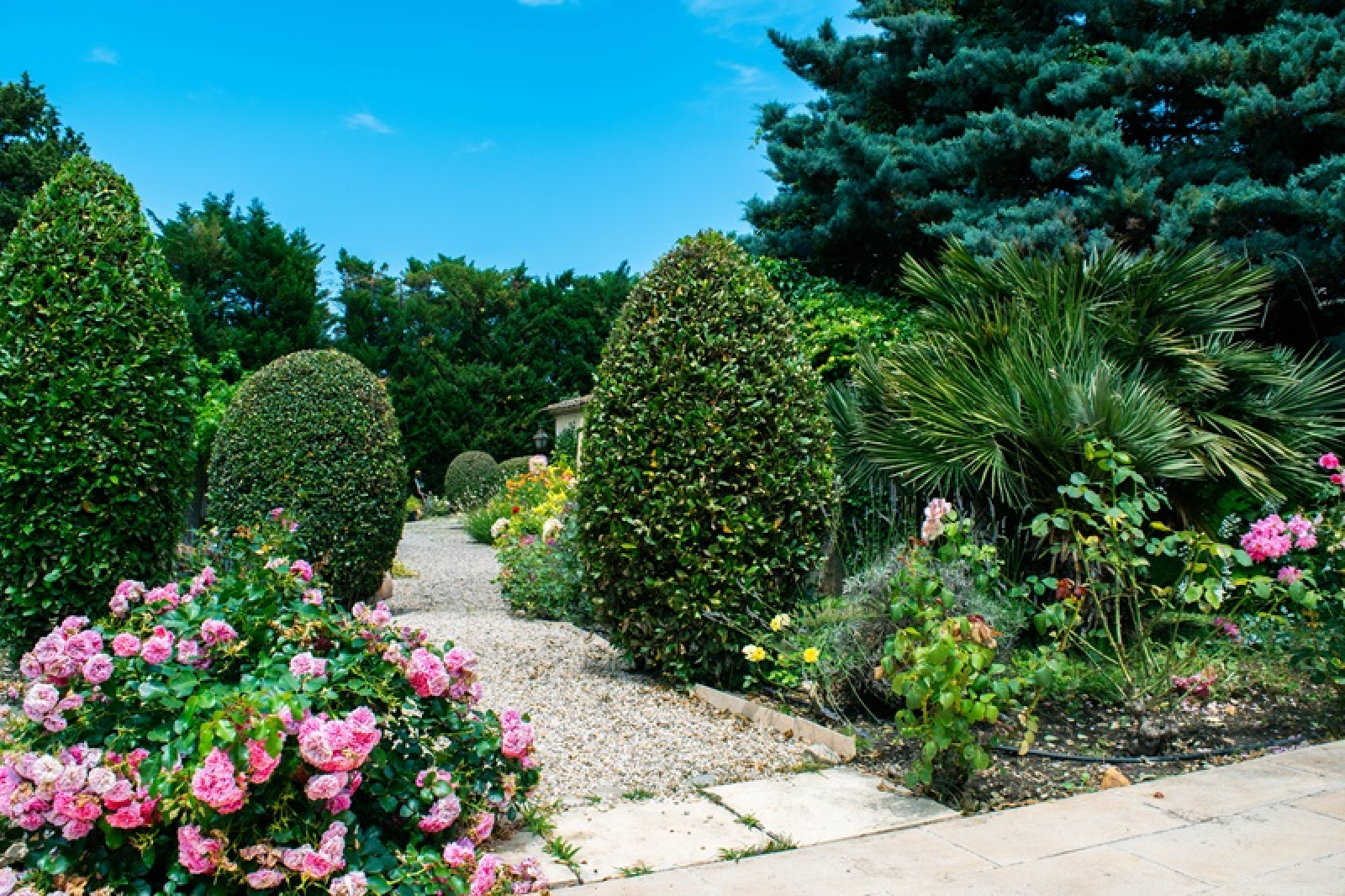 - Un jardin arboré avec des arbres fruitiers, des roseraies, un bassin d’agrément avec carpes koï et une fontaine