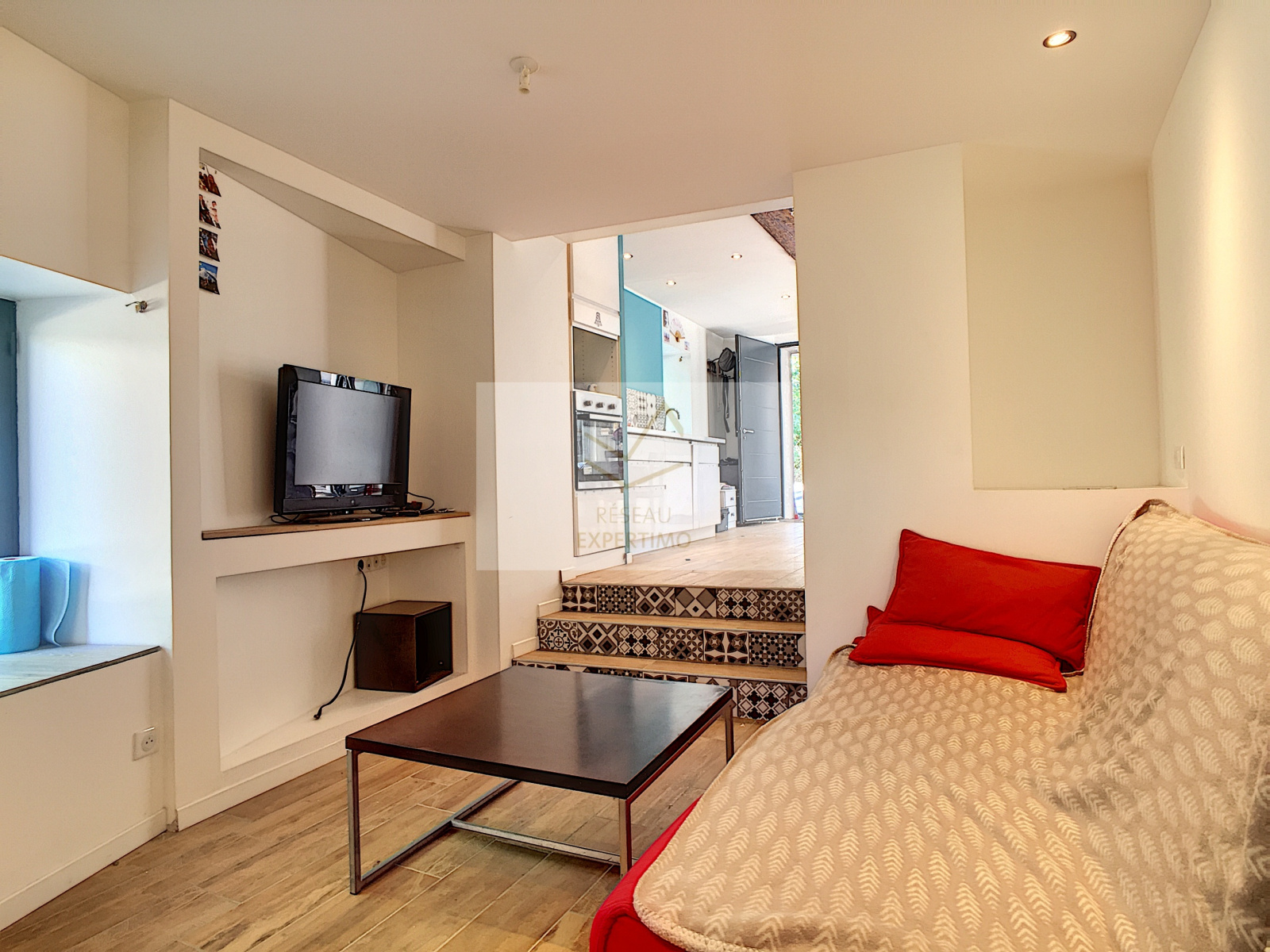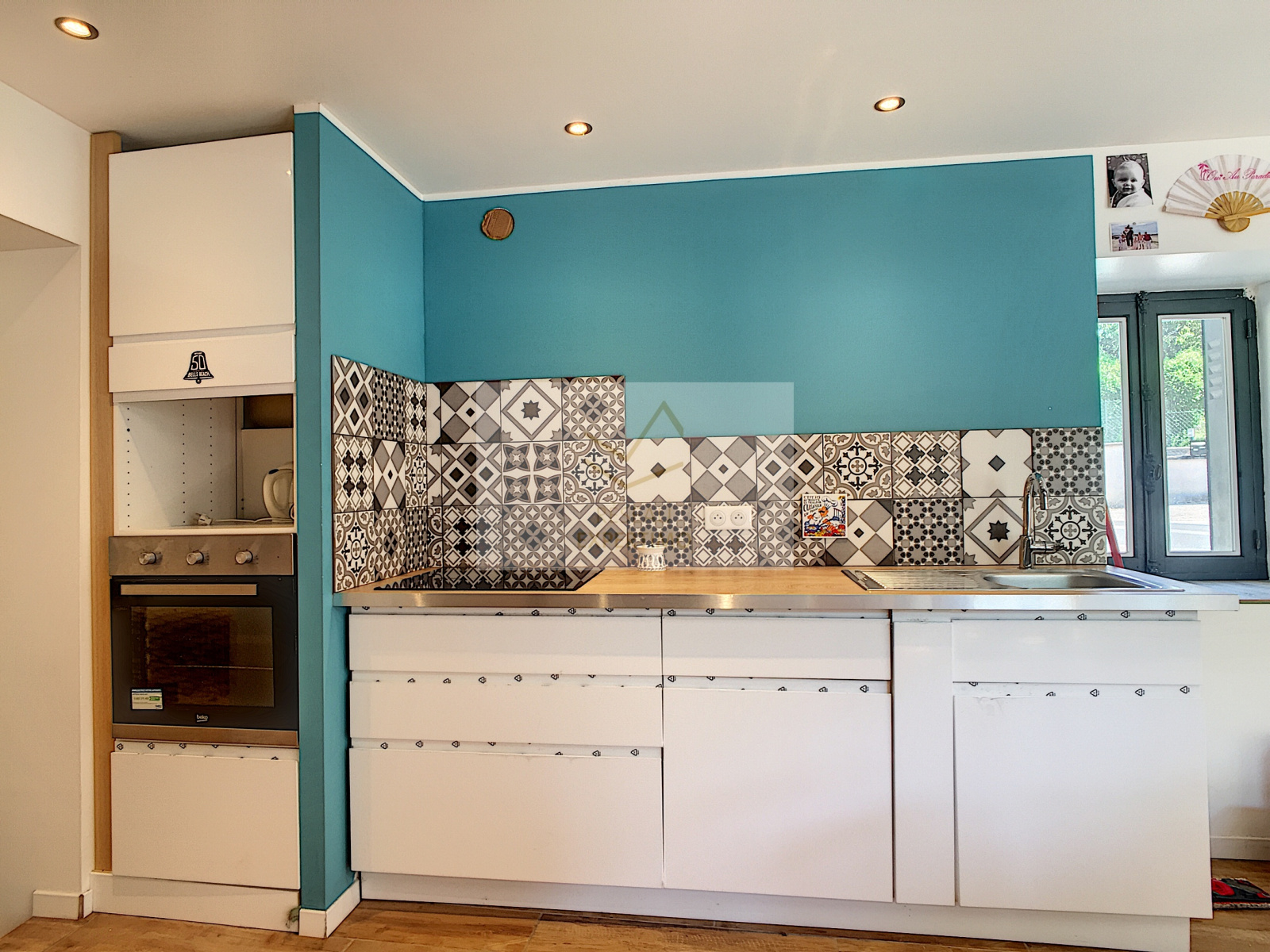 La pièce de vie en rez de chaussée possède une cuisine équipée et coin salon. La cuisine communique avec la terrasse et le salon. Elle est complétée par un WC et un coin buanderie.