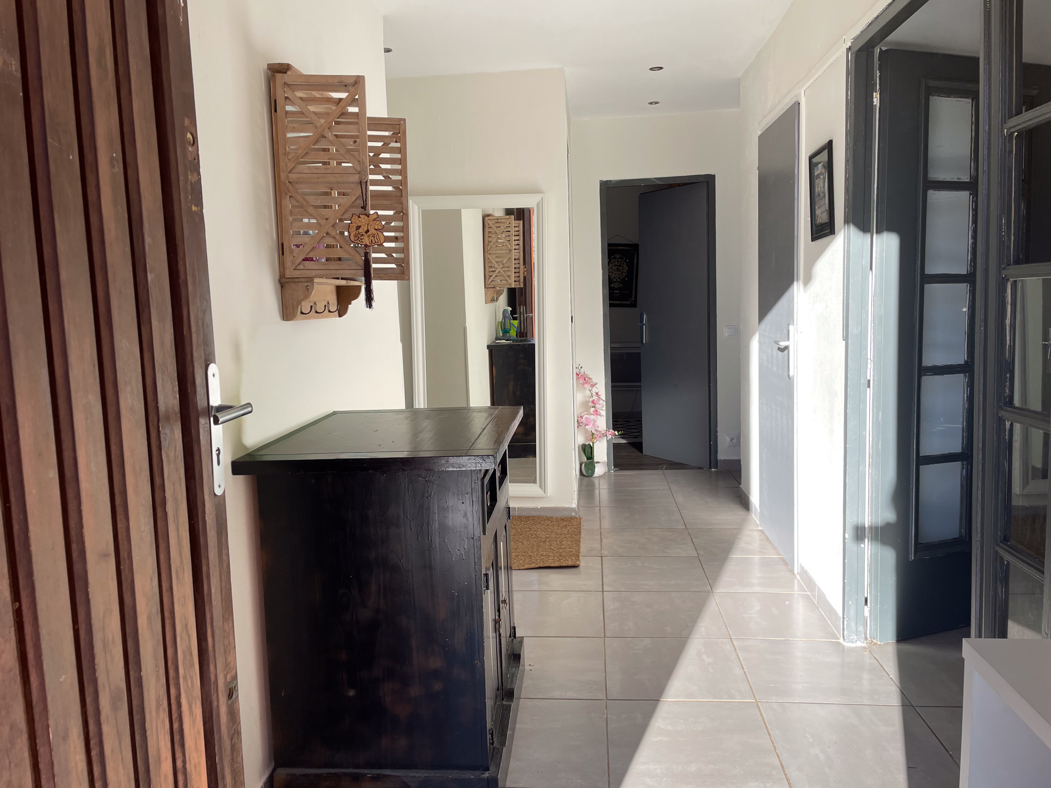 Elle s’ouvre sur une belle pièce de vie lumineuse, agrémentée de deux portes-fenêtres donnant sur une agréable terrasse couverte. La cuisine aménagée complète harmonieusement l’espace jour. La partie nuit comprend trois chambres, dont une avec porte-fenêtre, une salle d’eau et un WC séparé.