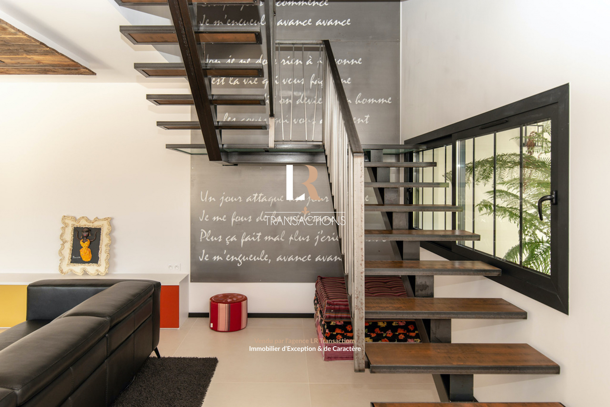 Dans l’un des coin du salon, un bel escalier poétique en acier vous permet d'accéder aux deux chambres de l'étage, et à leur salle d'eau avec WC.