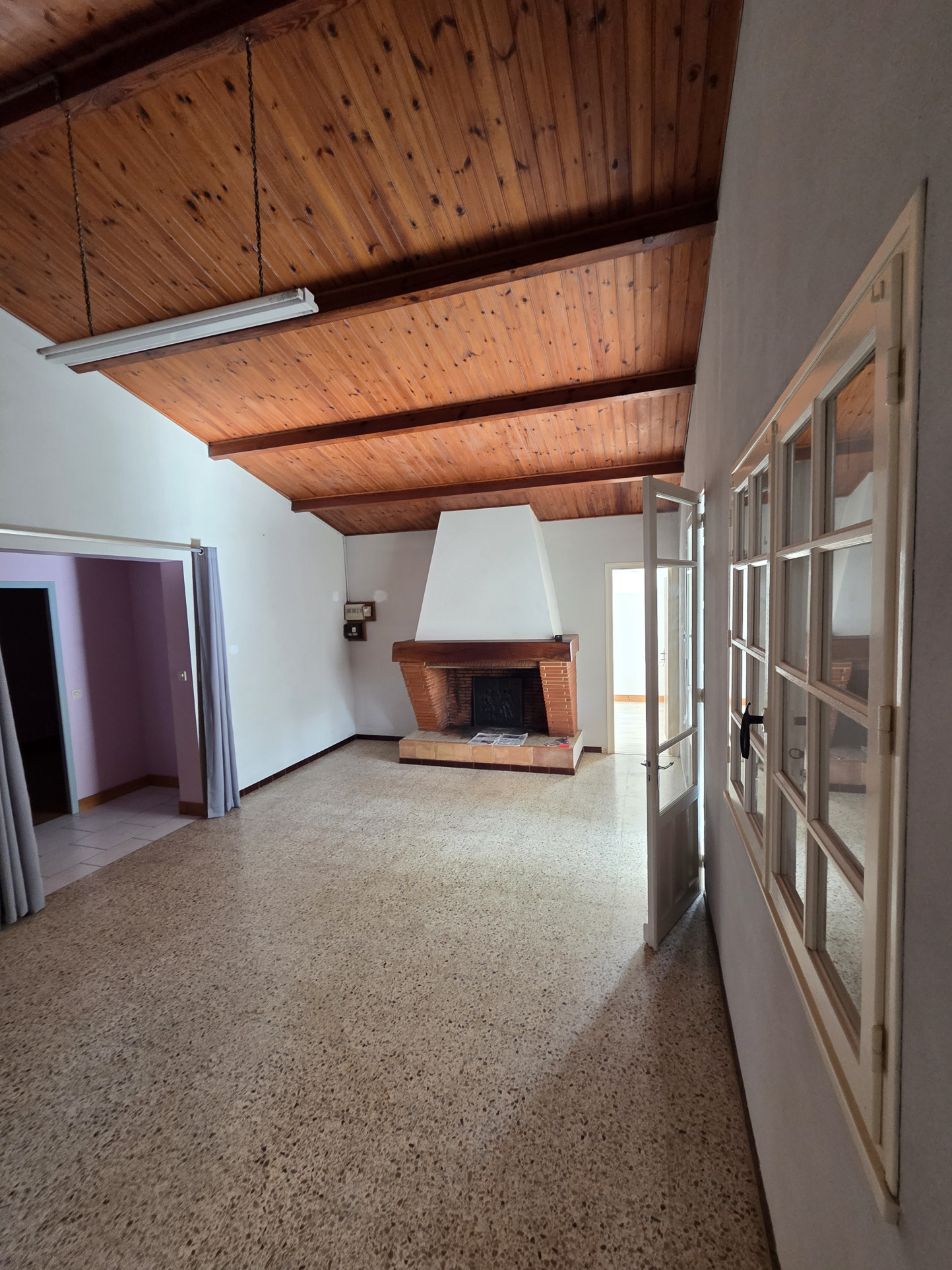 La maison est répartie entre une entrée/cuisine lumineuse avec double vitrage, suivie d'une salle à manger avec cheminée, une petite chambre, d'une salle d'eau avec toilettes, un couloir dessert deux très grandes chambres et un toilette indépendant.