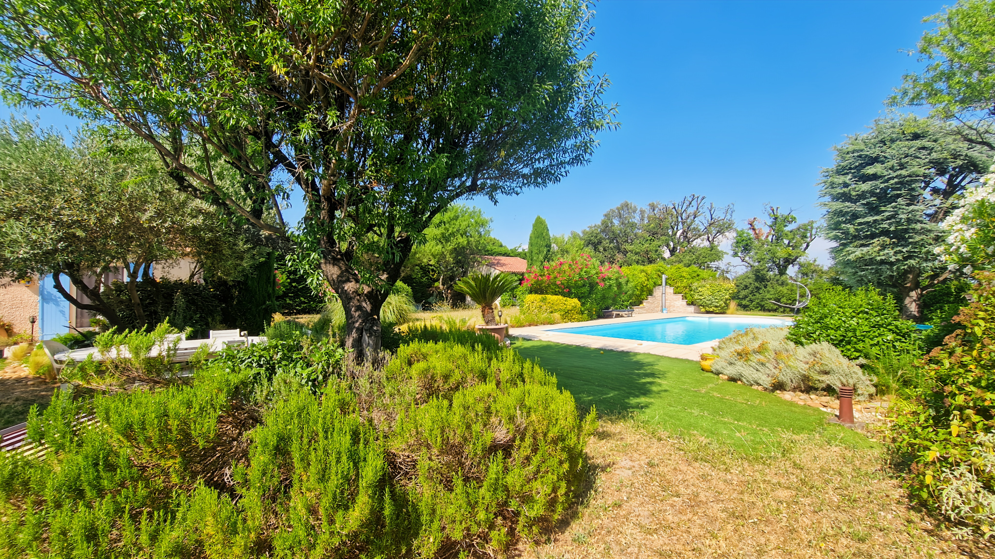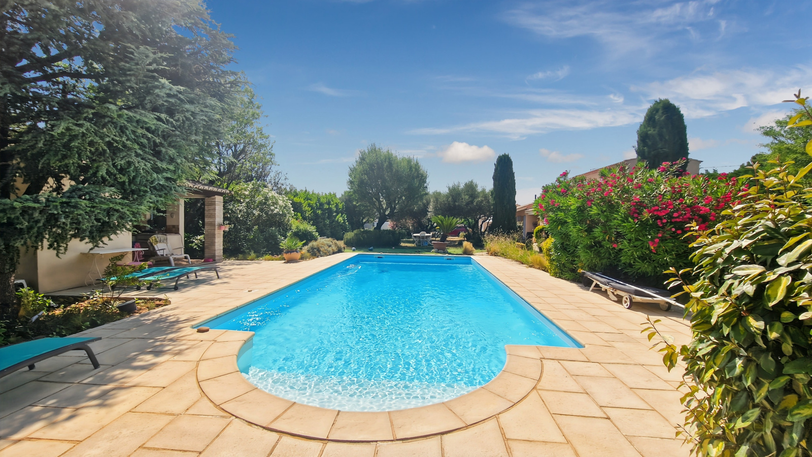 Au calme, plein sud et sans vis à vis, vous serez charmés par le magnifique parc de 2110 m2 entièrrement paysagé avec piscine au sel de 12x5, cuisine d'été avec wc, dépendance aménageable en studio.